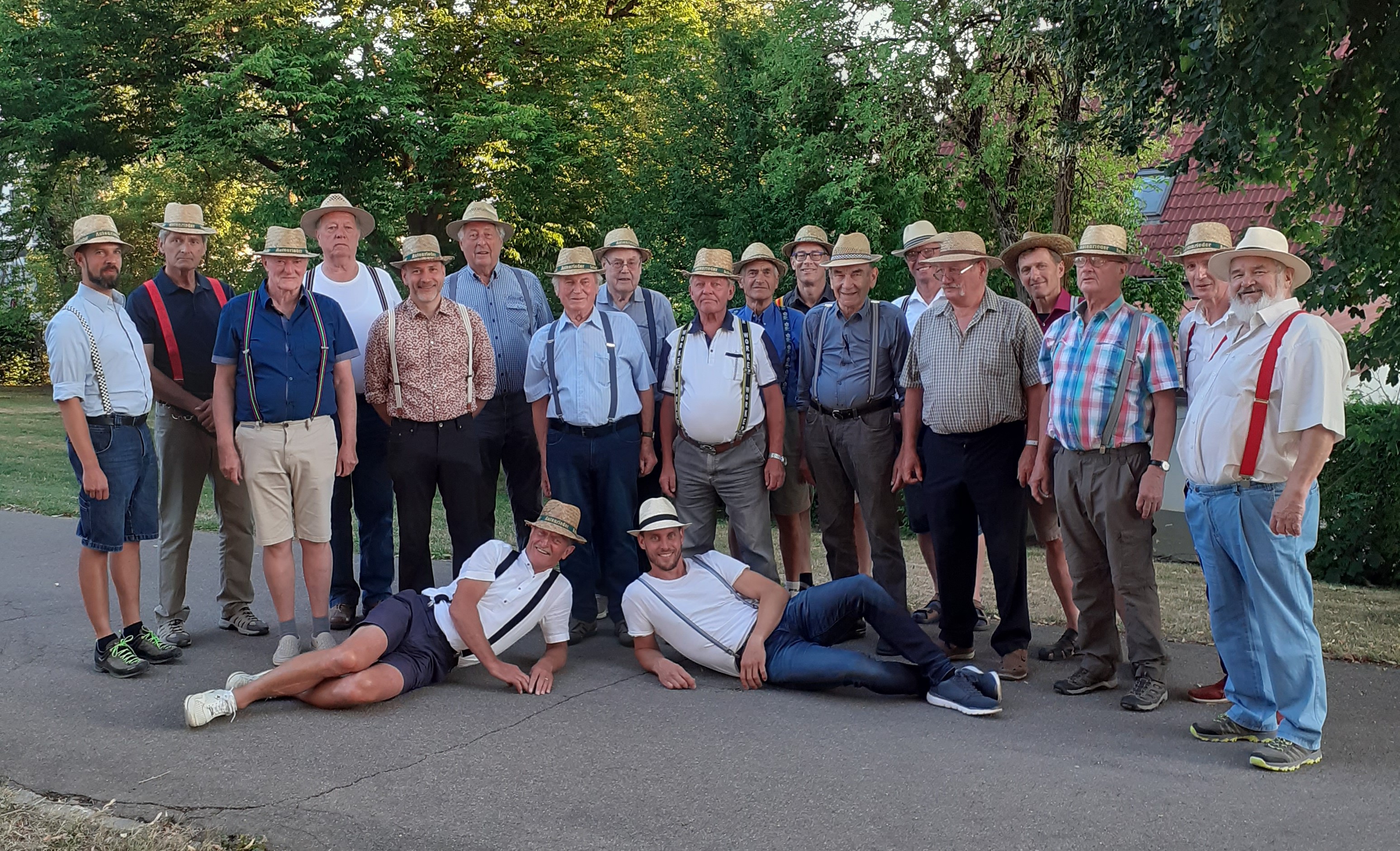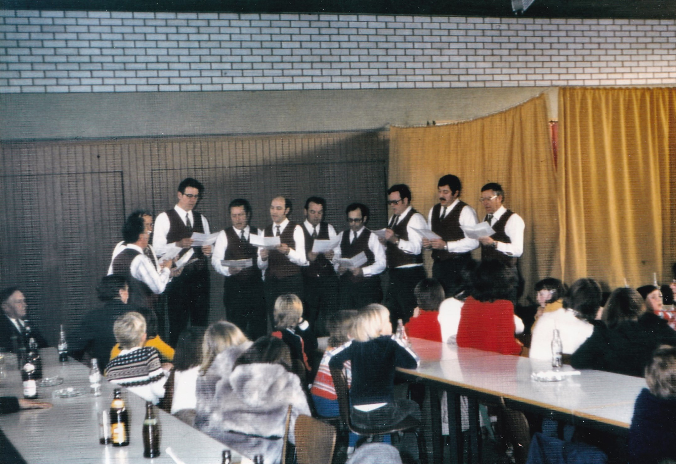 Der erste Auftritt des Schützenchors 1979 Walter Fischer, Willi Gall, Edwin Geist, Helmut Haßler, Erich und Georg Mändle, Hans Scheiffele, Hermann Schmeizl, Fritz Siehler und Ludwig Steeb (aus der Bahnhofstraße).